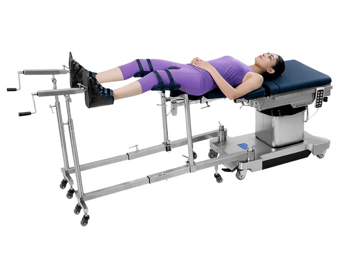 AM 01 enables precise lower-limb orthopedic and traction procedures, featuring SS 304 construction, an asymmetrical pelvic support plate, dual ball-joint traction assemblies, padded knee crutches, and universal OT table compatibility.